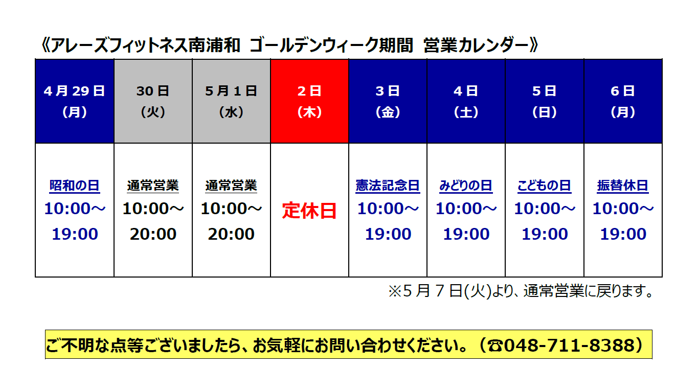 佐藤興産株式会社およびアレーズフィットネスのゴールデンウィーク期間中の営業は下記の通りとさせていただきます。何卒よろしくお願い申し上げます。