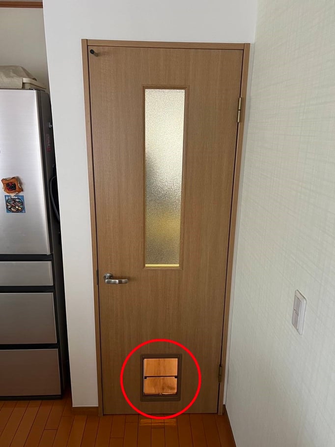 ネコちゃんが以前までくぐれていた「ペットくぐーる」が成長と共に大きくなり、おなかの部分が当たってくぐれなくなってしまった為、扉の交換をして「ペットくぐーる」のサイズを大きくした事によって、くぐれるようになりました。