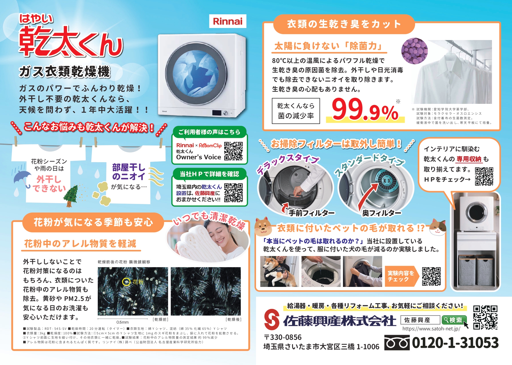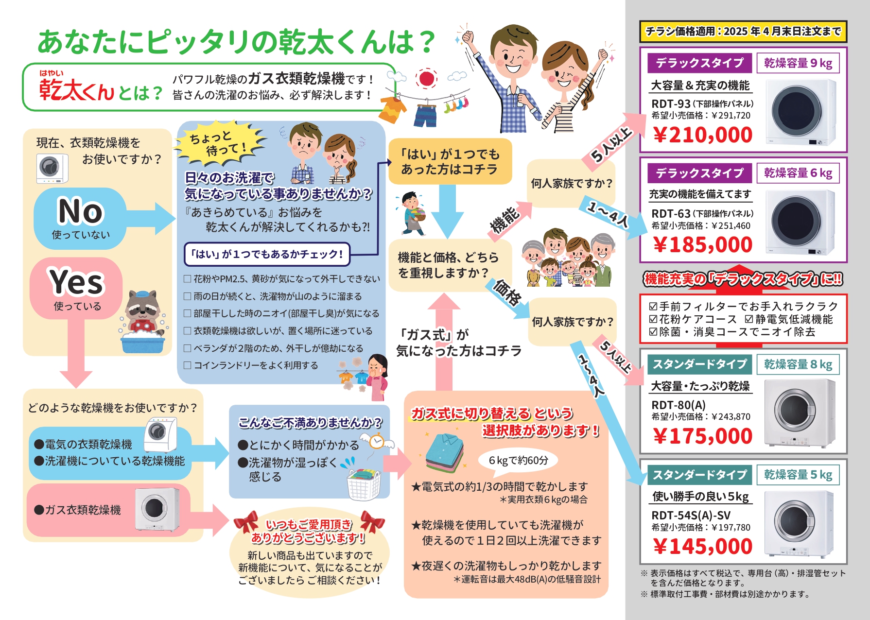2025年3月~4月末日までの期間、ガス衣類乾燥機「乾太くん」を特別価格でご案内します。