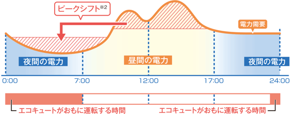 ※2 電力会社が節電を要請している9〜20時(特に13〜16時)に、エコキュートはほとんど運転(湯上げ)しない制御になっています。ただし運転モードやお湯の使い方によっては昼間時間帯でも運転を行います。ピークシフトとは、昼間の電力需要を、夜間などの時間帯へ移行させることです。