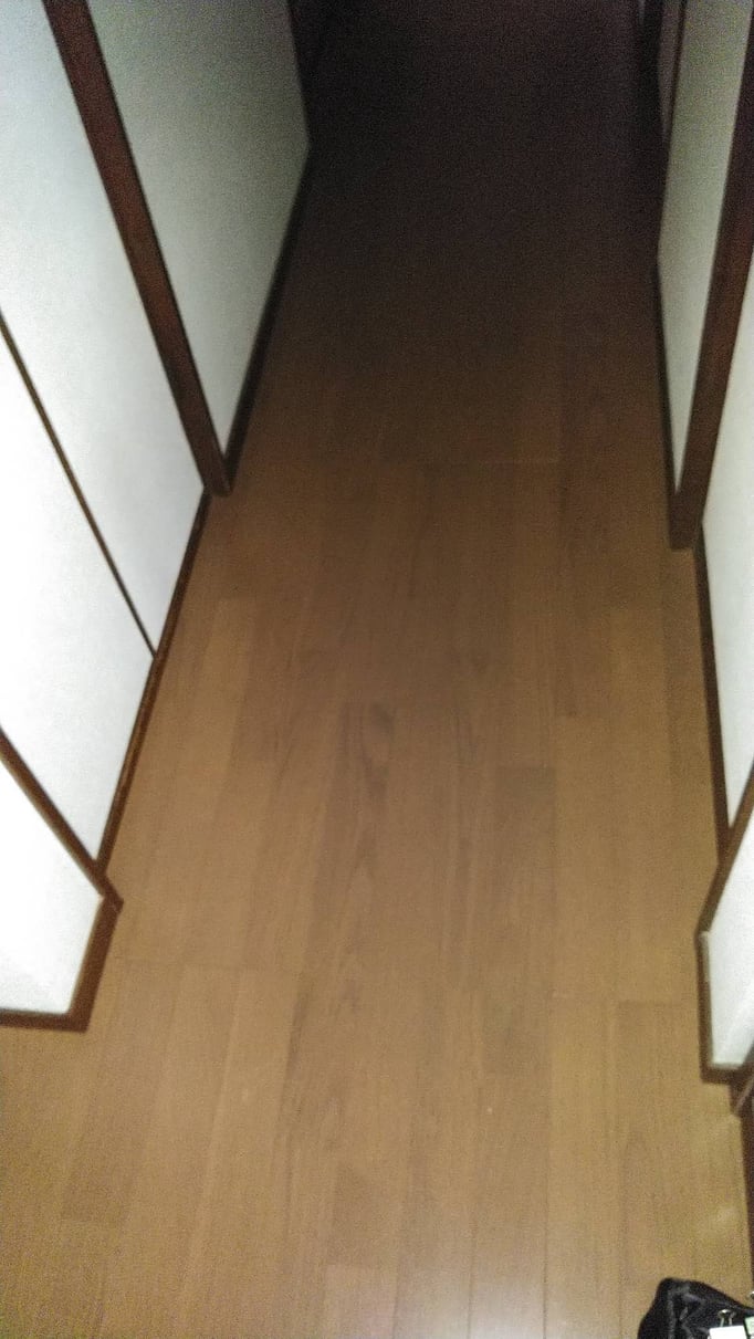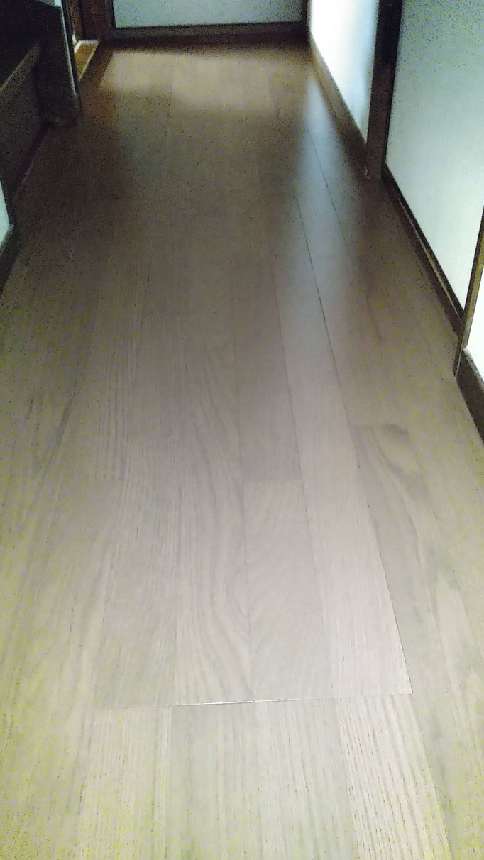 脱衣場入口の床板の沈み、和室入り口前の床板表面の剥がれをお客様が気にされており、廊下のフローリング張り替えをご依頼頂きました。