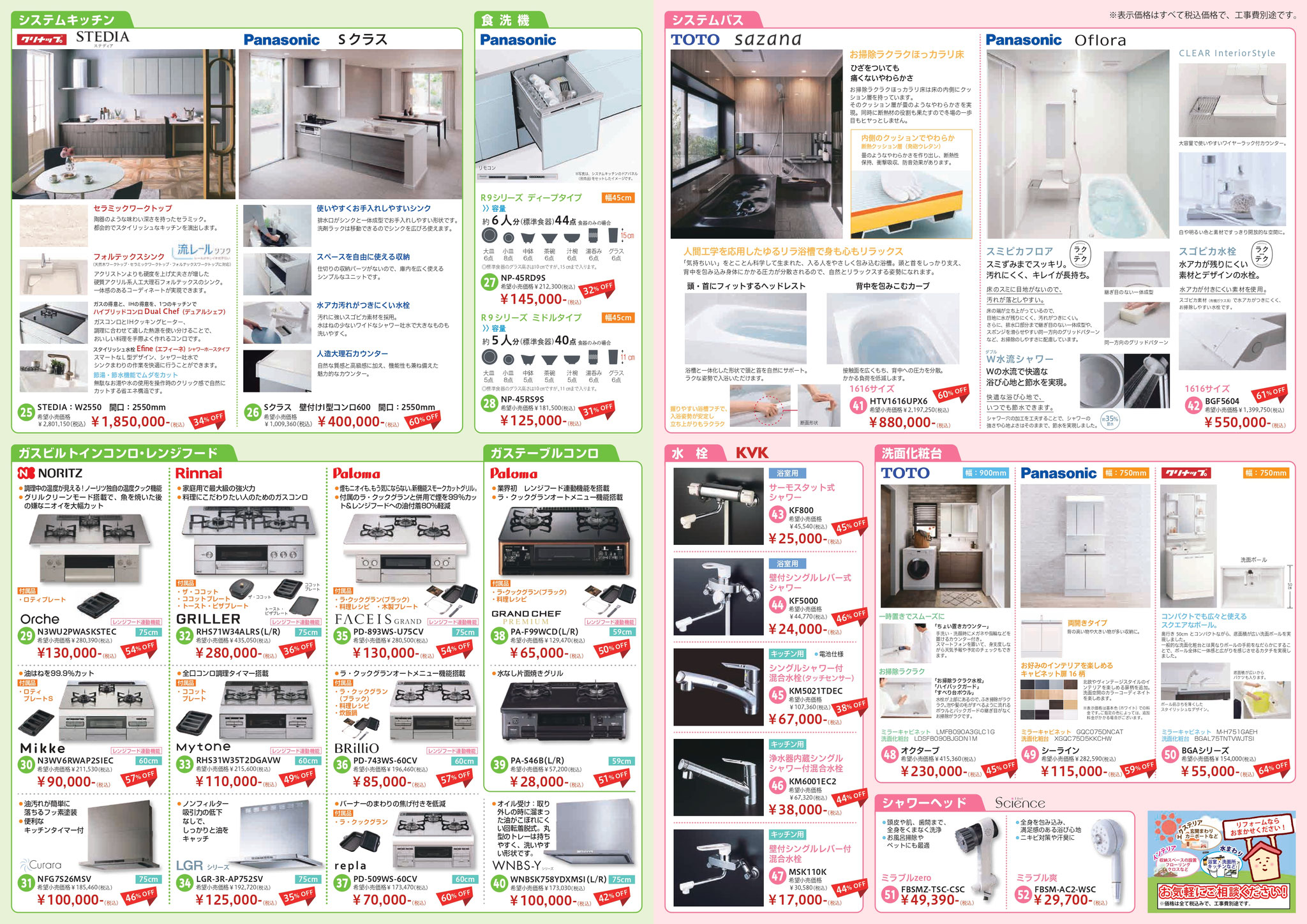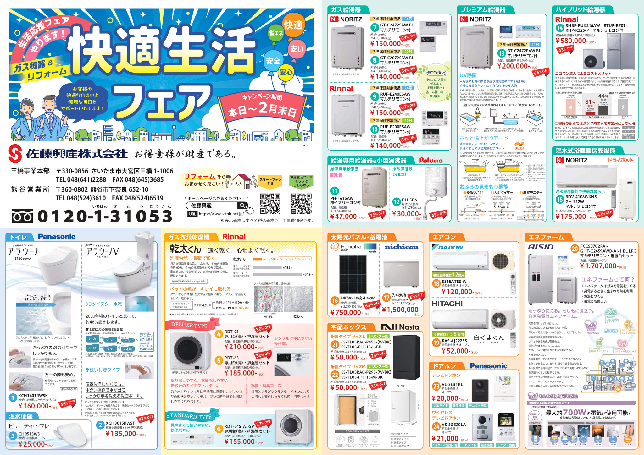 佐藤興産で毎年恒例の特価チラシ「快適生活フェア」の配布を開始しました。コンロや給湯器、ファンヒーターなどのガス機器をはじめ、システムキッチン、システムバス、トイレなどの住宅リフォーム商材等も幅広く取り扱っております。