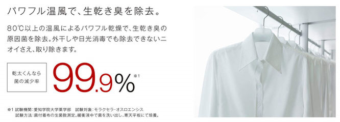 80℃以上の温風によるパワフル乾燥で生乾き臭の原因菌を除去。外干しや日光消毒でも除去できないニオイを取り除くので、生乾き臭の心配もありません。