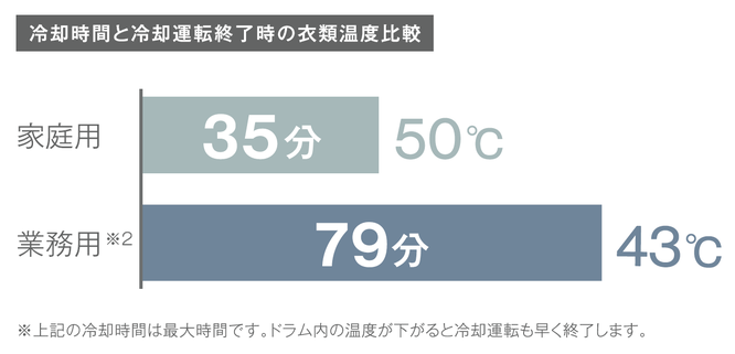 業務用乾太くんは、家庭用に比べて冷却時間を約2倍に延長し、冷却運転終了後の衣類の温度を7℃低下させます。