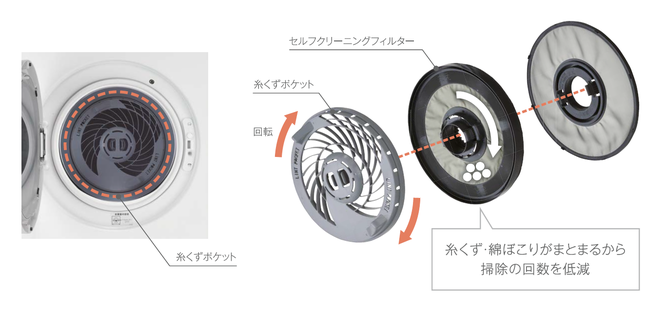 「セルフクリーニングフィルター」が自動で糸くず・綿ぼこりをかき集め、面倒なフィルター掃除の回数を低減。お手入れがより簡単になりました。