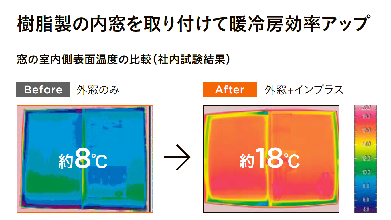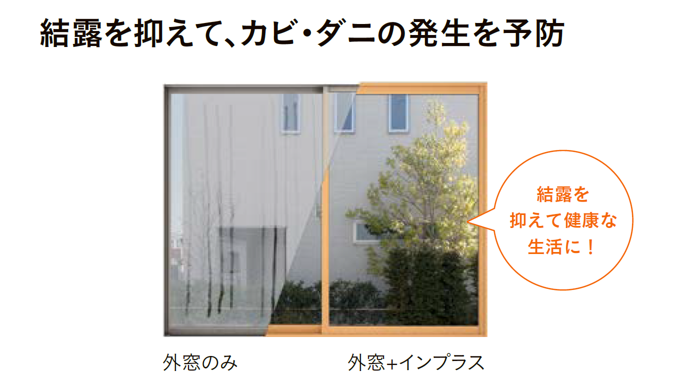 インプラスは樹脂製内窓です。樹脂の熱伝導率はアルミに比べて約1/1000、外気の温度に左右されにくく、断熱効果、結露を抑えてカビやダニの発生を予防する効果を発揮します。