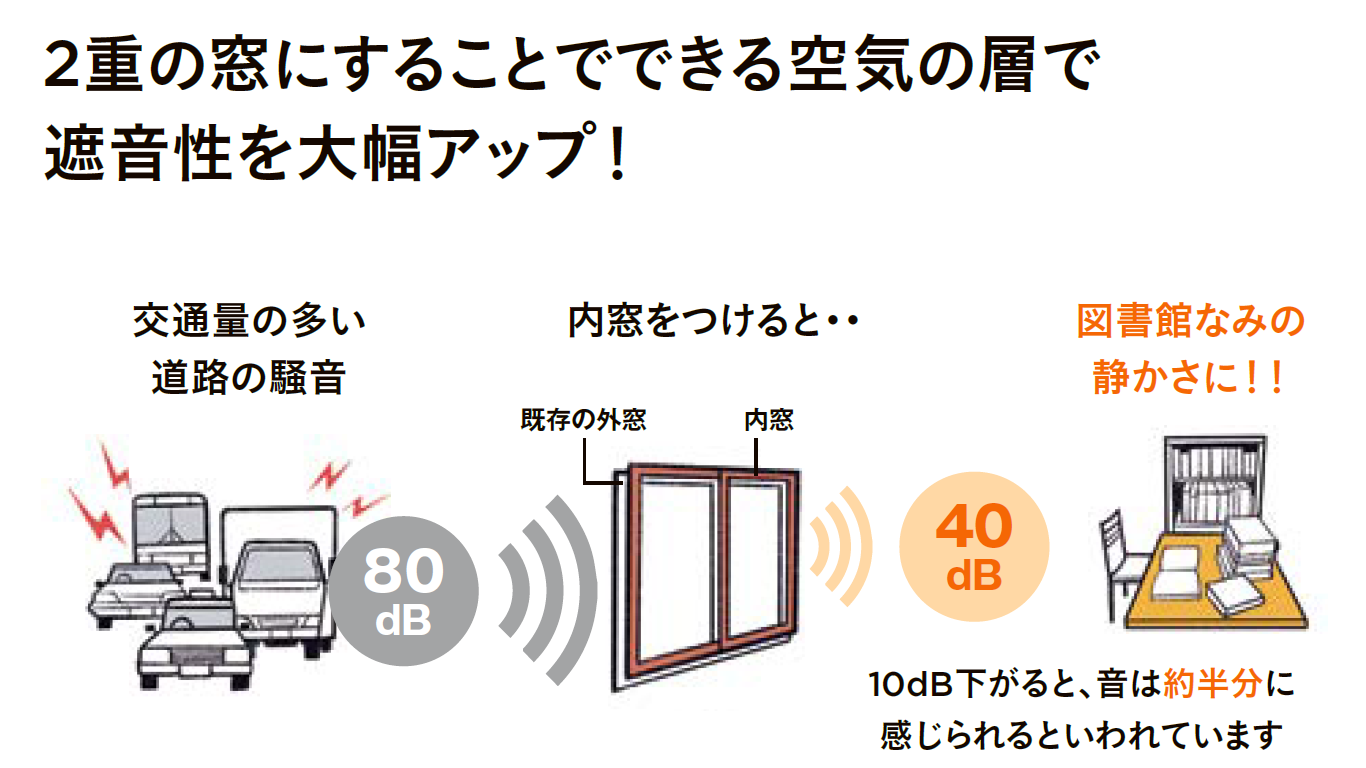 今ある窓の内側にLIXILの「インプラス」を取り付けることで、窓と窓との間に空気層が生まれます。これが壁の役割となり、断熱効果や防音効果を生み出します。