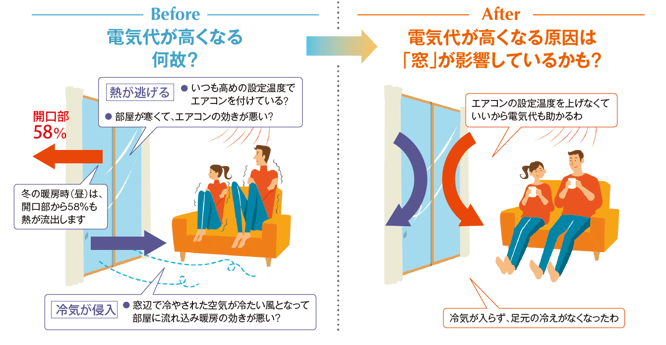 冬に室外から逃げ出す熱の約6割が窓などの開口部です。せっかく暖房で室内を暖めてもこれでは十分に効果が発揮できず、光熱費にも影響します。だからこそ、冬の寒さ&光熱費の対策には「窓リフォーム」がおすすめです。