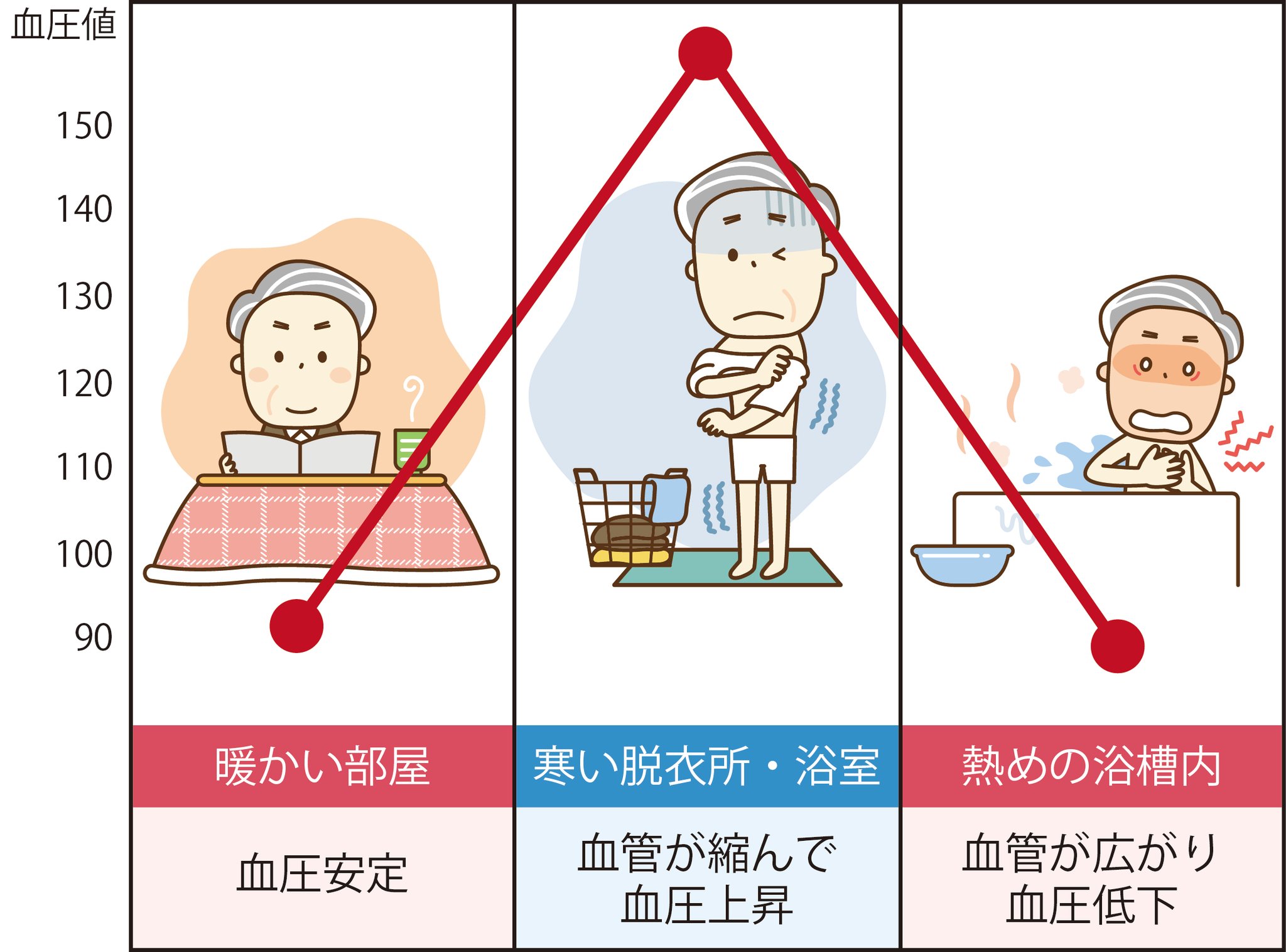 ヒートショックとは、急激な温度の変化によって血圧の乱高下や脈拍の変動が起こる健康被害のことです。失神や不整脈を起こしたり、急死に至る危険な状態で、気温の下がる冬場に多く見られます。ご高齢の方、高血圧の方、糖尿病や脂質異常症の方は、特に注意が必要です。浴室暖房乾燥機の暖房機能を使用すると、冷え込みやすい浴室が暖まり、急激な温度の変化がなくなるので、ヒートショックの対策につながります。